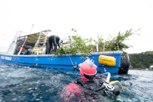 投錨を軽減するため、関係各所と協力し固定ブイ(梵天)の設置・維持管理を実施しています。 また様々な環境保護活動を通じて観光との両立を目指しています。